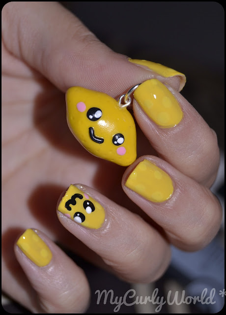Es una manicura sencilla, basada en dos tonos de amarillo y con la carita kawaii como el limón